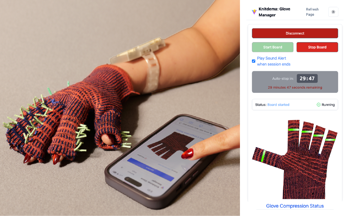 Hand edema hinders mobility and quality of life, yet prevailing solutions—manual lymphatic drainage or bulky pneumatic devices—are costly, clinic-bound, and rarely personalized. We introduce EdemaFlex, a textile-integrated soft-robotic platform that generates participant-specific devices; here, we demonstrate a tubular jacquard-knit glove whose embedded shape-memory-alloy actuators deliver programmable distal-to-proximal compression. The actuators reach a therapeutic pressure of 20–30 mmHg within 2–3 s and provide distal-to-proximal sequential compression for multiple 30 min sessions. In a seven-participant “home-based study,” the EdemaFlex glove proved to be accessible for unsupervised use and feasible as a tool to reduce swelling, ensuring safety: hand volume decreased by up to 25%, digit and Figure-of-Eight circumferences by up to 9.3% and 4.7%, range of motion increased up to 50%, and dexterity (Box-and-Block test) improved by 8–150%. The EdemaFlex System offers a textile-based, soft-robotic platform for personalized edema therapy.
